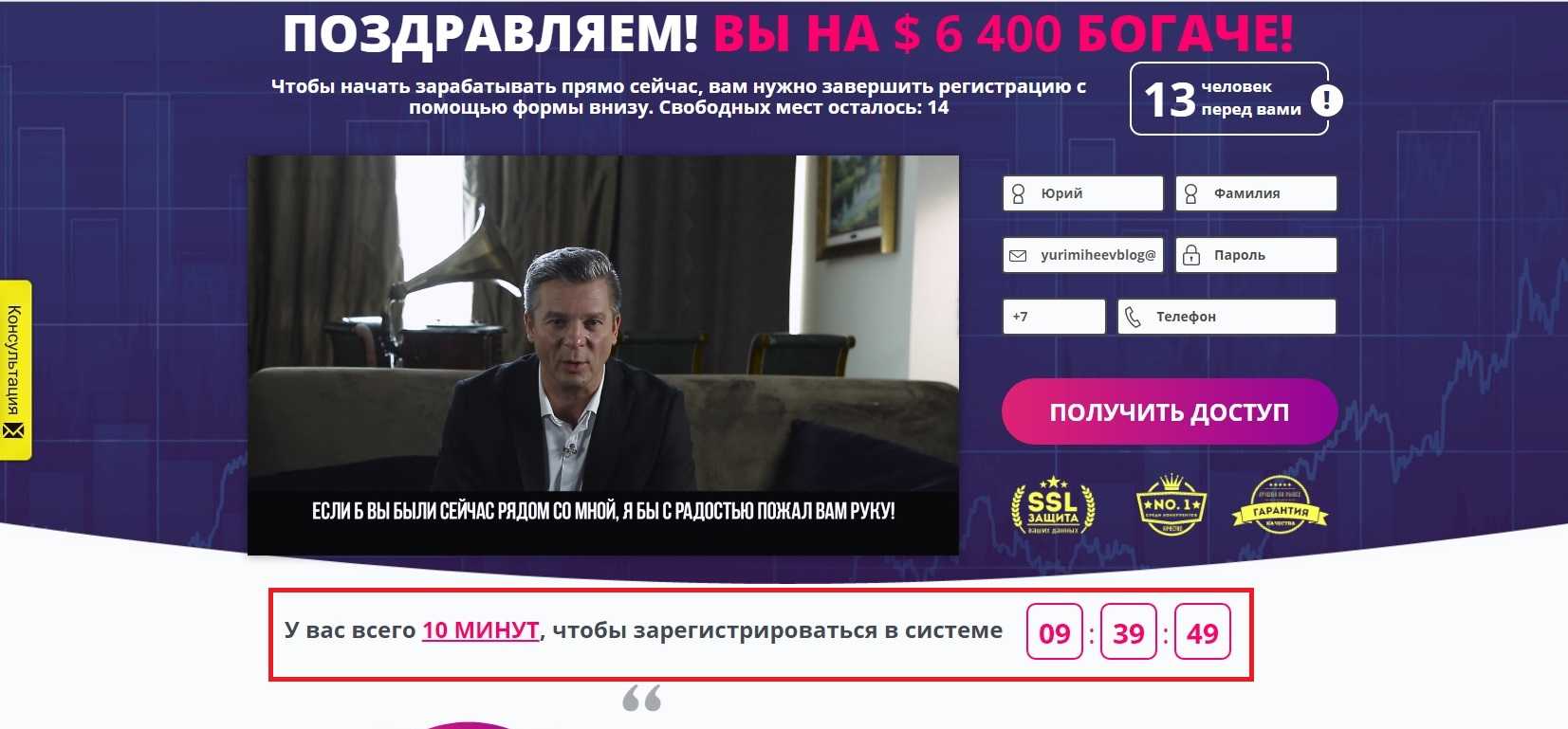 - есть призыв к действию, то есть нужно быстрее зарегистрироваться, потому что осталось всего одно место (сделано это для того чтобы вы долго не думали и не искали отзывы в интернете о этой схеме развода);