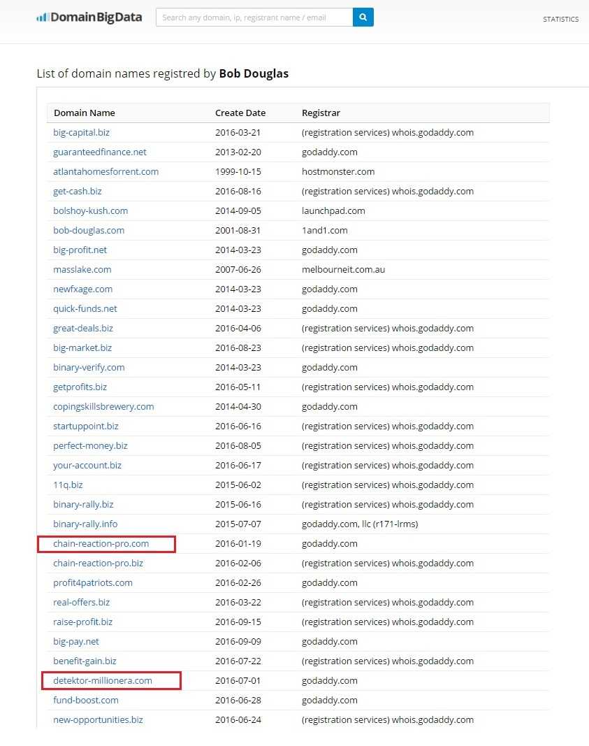 Я не буду писать о том, что никакой робот не заработает вам денег и что без знаний стать состоятельным человеком нельзя. Я писал об этом уже очень много раз. Просто представлю вам факты. Начнем с того, что создатель «Детектора Миллионера», это тот же самый лоховод, который уже грабил, да и продолжает грабить наивную общественность с помощью таких лохотронов как «Цепная реакция», «Клик на миллион» и «Алгоритм Королева». Все эти проекты принадлежат одному и тому же человеку и зовут его Боб Дуглас.