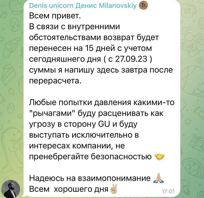 На данный момент забег Единорога продолжается. Но для бега нужна энергия, поэтому все новые люди отдают этому скам-проекту деньги в надежде на чудо. Мы не знаем, чем это все закончится, но чуда точно не будет. А будет много поломанных судеб, разочарованных людей и лишь несколько резко разбогатевших человек из Gold Unicon. Печально осознавать, что таким людям даже без четкого инвестиционного плана, без лицензий на ведение деятельности, с максимально запутанной документацией удается обмануть такое количество наивных ребят. Думайте своей головой, максимально изучайте потенциальный фонд для вложения и не видитесь на сказки о гарантированной прибыли. Выбирайте обычную рабочую лошадь, которая будет пахать и приносить прибыль, пусть и не такую большую. А Золотой Единорог пусть отправляется в свою вымышленную страну и бегает по розовым облакам.