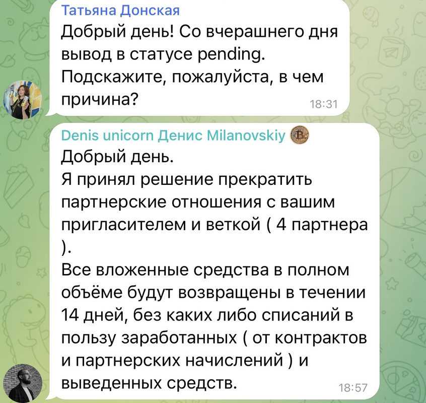Когда сомневающихся становится больше, вслед за сайтом глючит вывод средств и расторжение договоров с теми, кто особо «паникует». Хорошо хоть обещает деньги вернуть в течение двух недель.