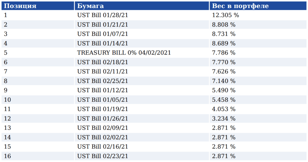 Портфель Cash Equivalents ETF состоит исключительно из краткосрочных государственных облигаций США. А точнее казначейских векселей —Treasury Bills или T-Bills — со сроком погашения от одного до трех месяцев.
