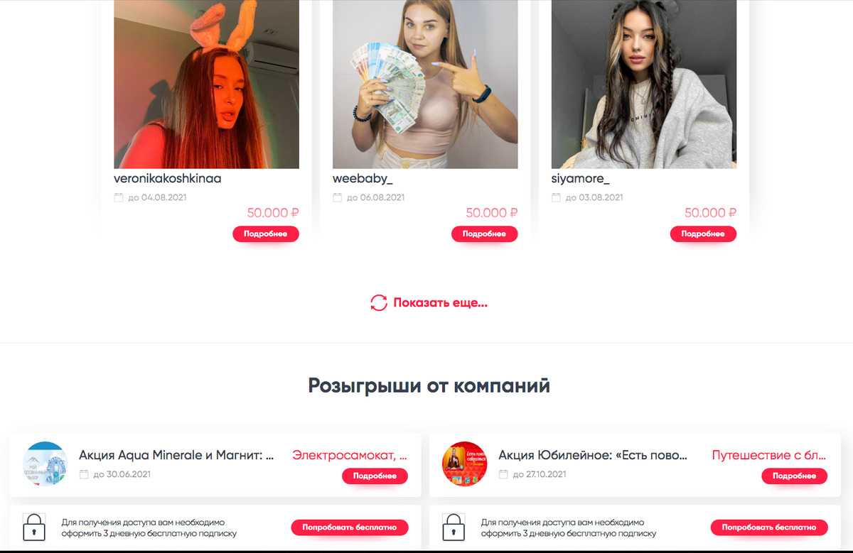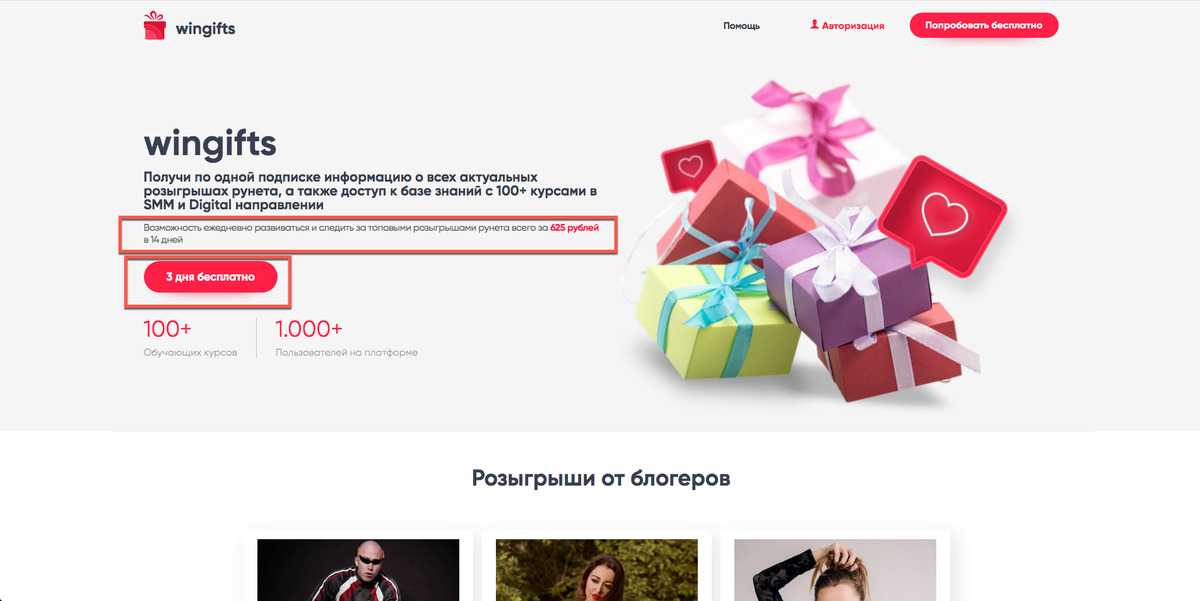 - Пользователь попадает на главную страницу сайта https://wingift.org/, где ему предлагается получить доступ к информация о всех розыгрышах и акциях рунета, а также доступ к базе знаний с курсами по SMM и Digital. Ниже на сайте можно увидеть примеры розыгрышей и предложений.