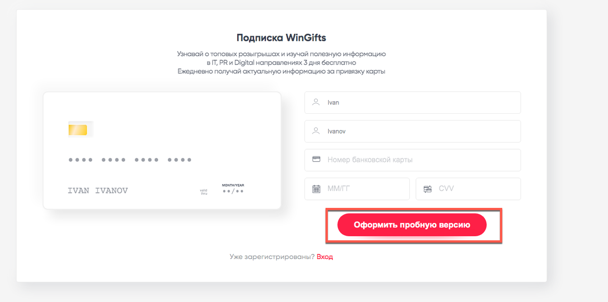 После нажатия на «3 дня бесплатно» откроется анкета для заполнения. Здесь потребуется заполнить данные, а также принять публичную оферту и условия подписки.