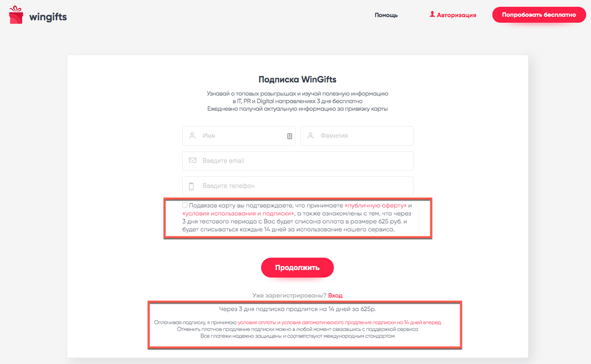 Способ 2. WinGift в документах сообщает, что подписка может быть оформлена через сервис CloudPayments. В данном случае подойдет следующая инструкция.