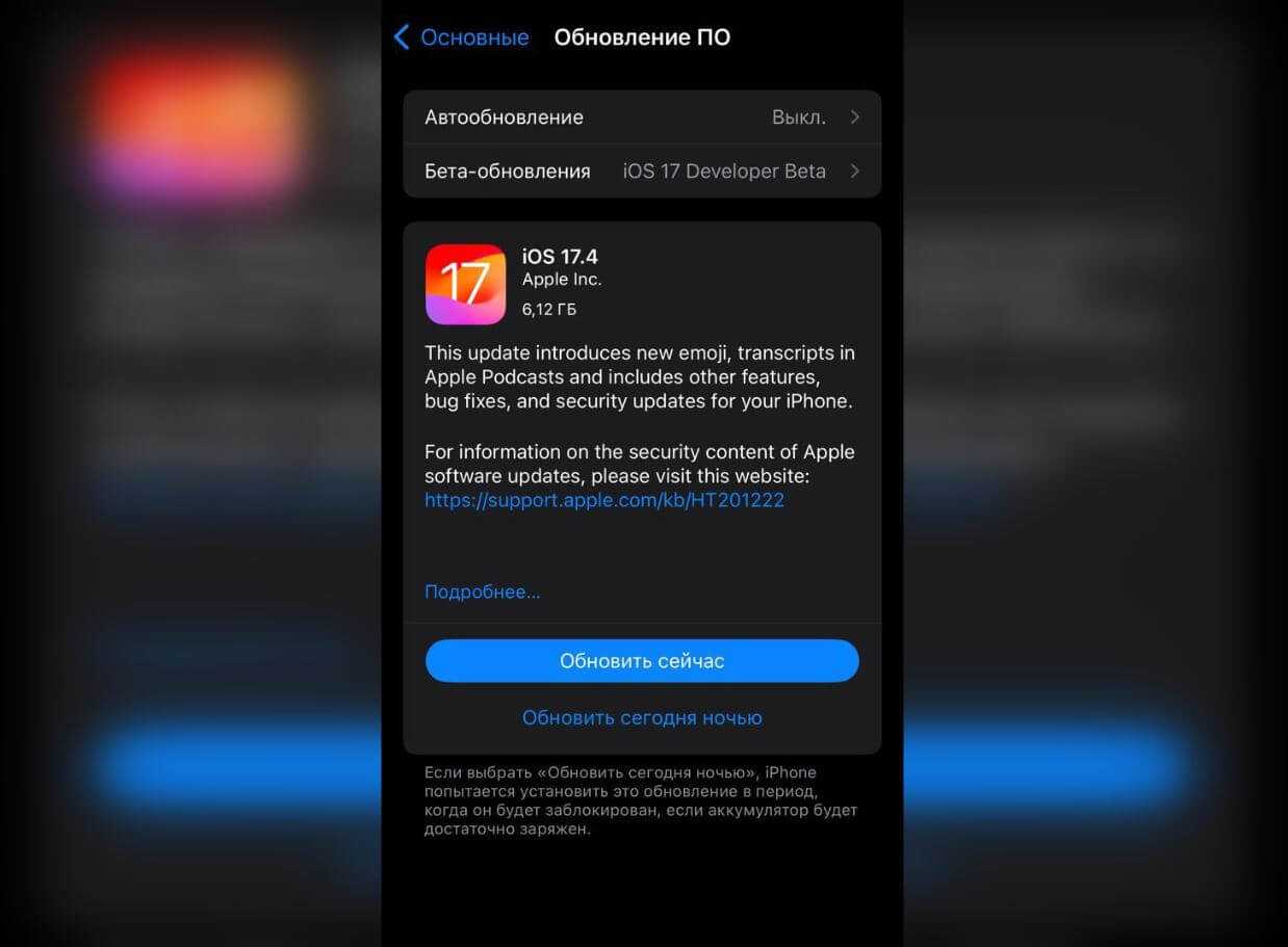 - Затем нажмите «Обновить сейчас», чтобы установить iOS 17.4 незамедлительно, или «Обновить сегодня ночью».