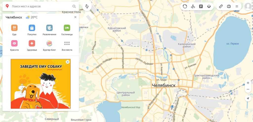 При входе на Карты по умолчанию мы видим самые популярные среди пользователей категории мест, а также возможность включить режим отображения нагрузки на дорогах, посмотреть панорамы интересующих локаций, найти ближайшую парковку, измерить расстояние и другие возможности.