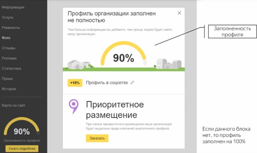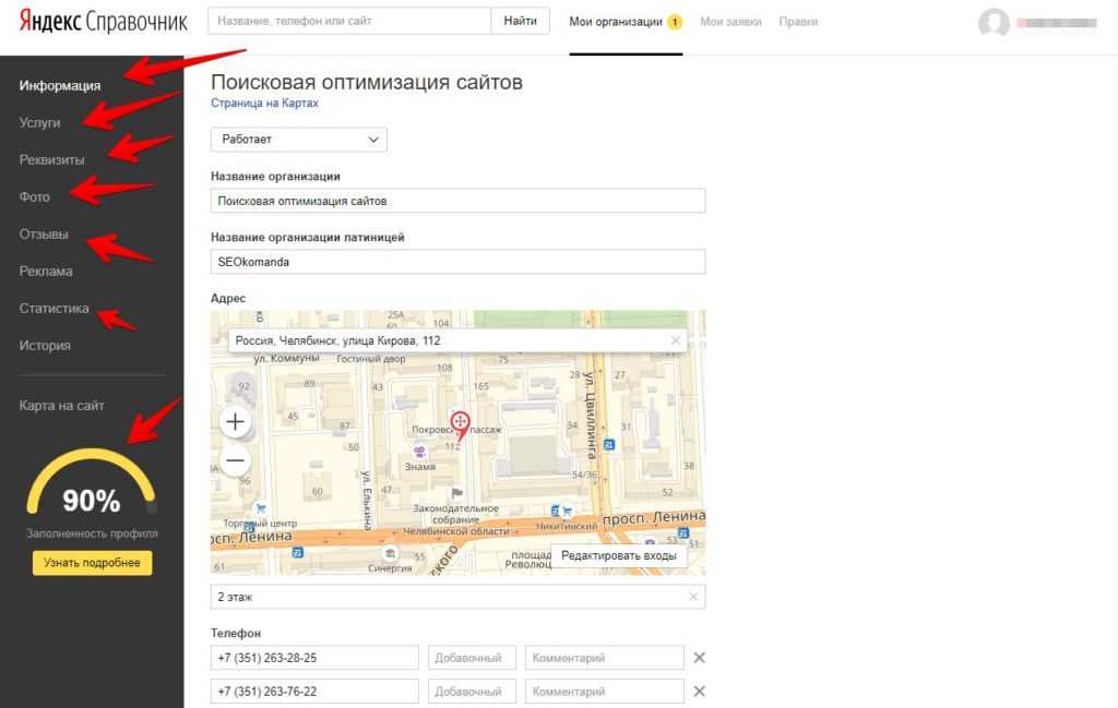 После того, как получены права на управление информацией в Яндекс.Справочнике, обязательно максимально подробно заполните все доступные вкладки и поля. Чем выше процент заполненности профиля, тем больше шансов, что карточка организации получит высокие позиции и привлечет заинтересованных пользователей.