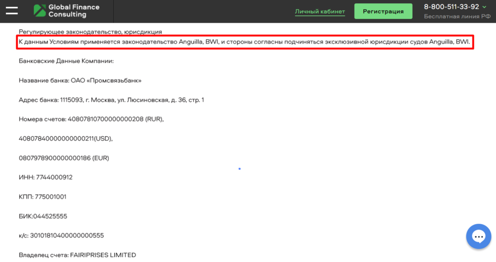На самом деле, из всего вышеперечисленного о брокере Global Finance Consulting, уже становиться понятно, что брокер явно затевает что-то мутное. Ни одна уважающая себя компания не станет так открыто врать о данных регистрации или номерах сертификатов, но аферистам все равно. Но как бы они не старались, скрыть полностью всю информацию о настоящей регистрации им не удалось. В документах брокера указано, что к условиям соглашения брокера применяется законодательство Ангильи (это остров в Британской Вест-Индии). Данное государство является оффшорной зоной. Какие-либо претензии и иски в отношении брокера размариваются в судах Ангильи. Это значит, что фирма зарегистрирована там и подчиняется юрисдикции этого офшорного государства.