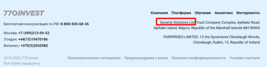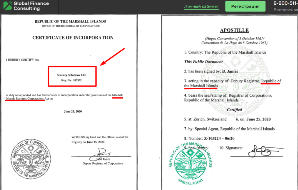 На сертификате по-прежнему указана компания Seventy Solutions Ltd, которая родом из Маршалловых островов и которая имеет прямое отношение к 770Invest.