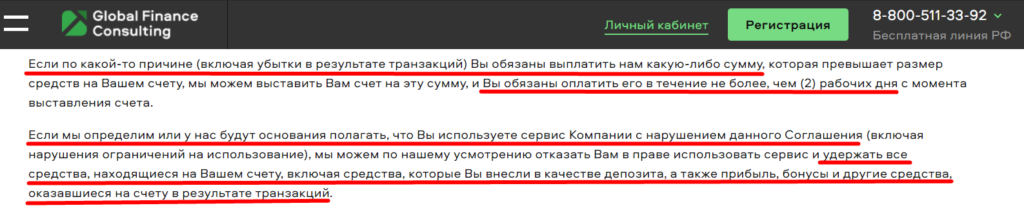 Также Global Finance Consulting открыто заявляют, что если у них будут основания полагать, что вы нарушаете соглашения, то ваши средства могут просто заморозить. Это одна из основных уловок, которые используют мошенники . Вы еще, может, не начали торговать, а у них уже заготовлены ситуации, в которых вас могут обвинить и заморозить ваши деньги.