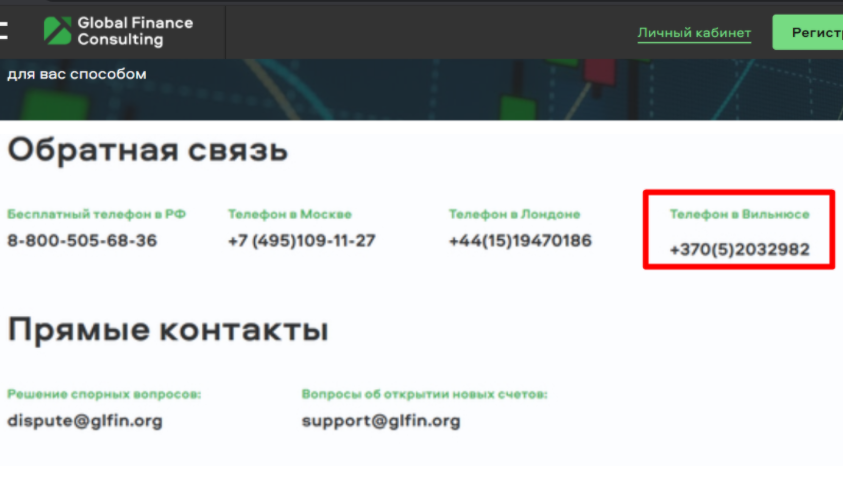 Еще совсем недавно на сайте брокера красовался телефонный номер в Вильнюсе +370 (5) 2032982. До того момента, пока мошенники не поняли свою ошибку и поэтому сразу же удалили этот контакт.