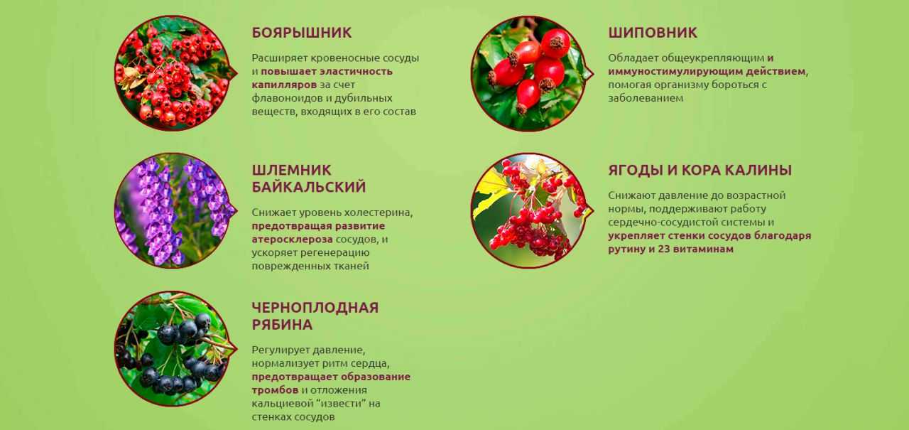 Все эти растения объединят одно: они богаты различными минералами и витаминами, которые в той или иной степени действуют на укрепление стенок сосудов, повышая их эластичность, снижают проницаемость капилляров, понижают уровень «плохого» холестерина, нормализуют уровень гемоглобина. А также оказывают общее успокаивающее действие на сердечно-сосудистую систему. При этом: