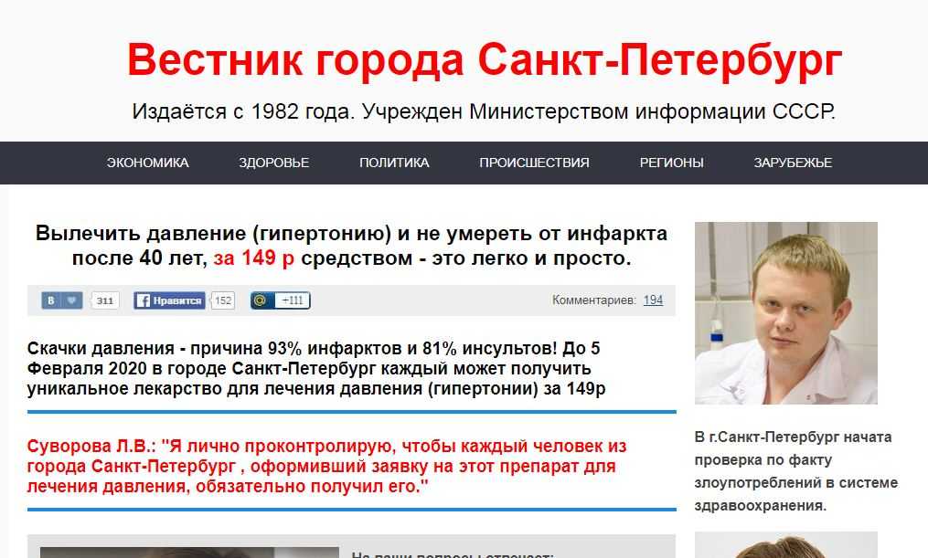 Начнем с фейкового сайта Вестник города. В данном случаем Санкт-Петербурга, просто я сейчас в Питере и на сайте автоматически подставляется ваш город. Когда я заходила на сайт из родного Белгорода, там был Вестник города Белгород. Тоже очень интересный прием у них.