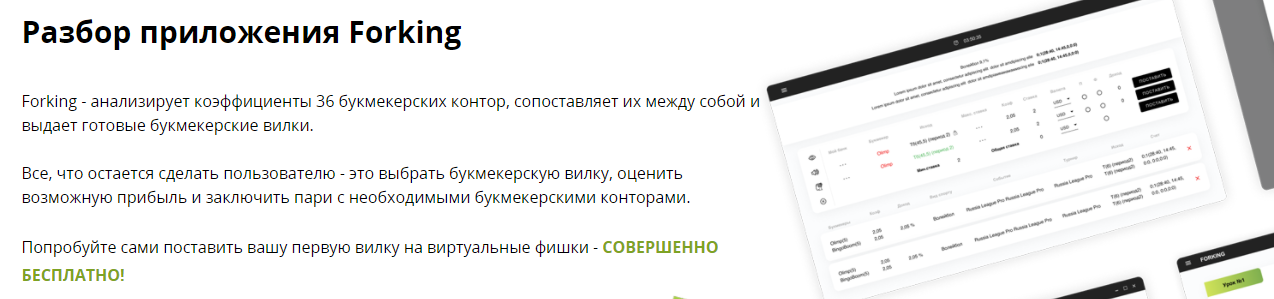 Программ-сканеров в сети много. Часть софта анализирует под 100 российских и иностранных БК. Приложения отличаются довольно сильно. Однако на официальном сайте Forking никаких реальных преимуществ софта или конкретных данных (за исключением количества букмекеров) не указано.