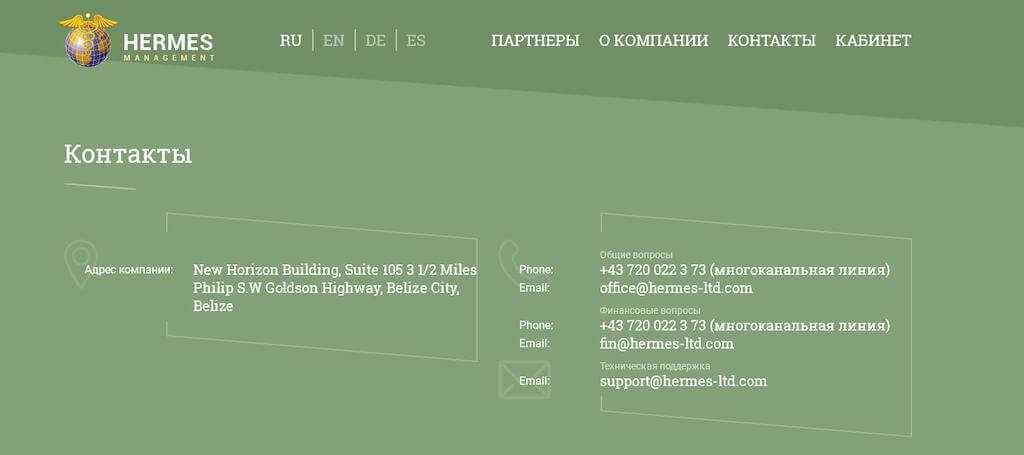 Если на официальном сайте Гермес Менеджмент ЛТД зайти в раздел с контактными данными, то изобилию информации удивляться не приходится. На выбор только электронная почта и два номера телефона в Австрии. При этом фигурирует почтой адрес в Белизе.