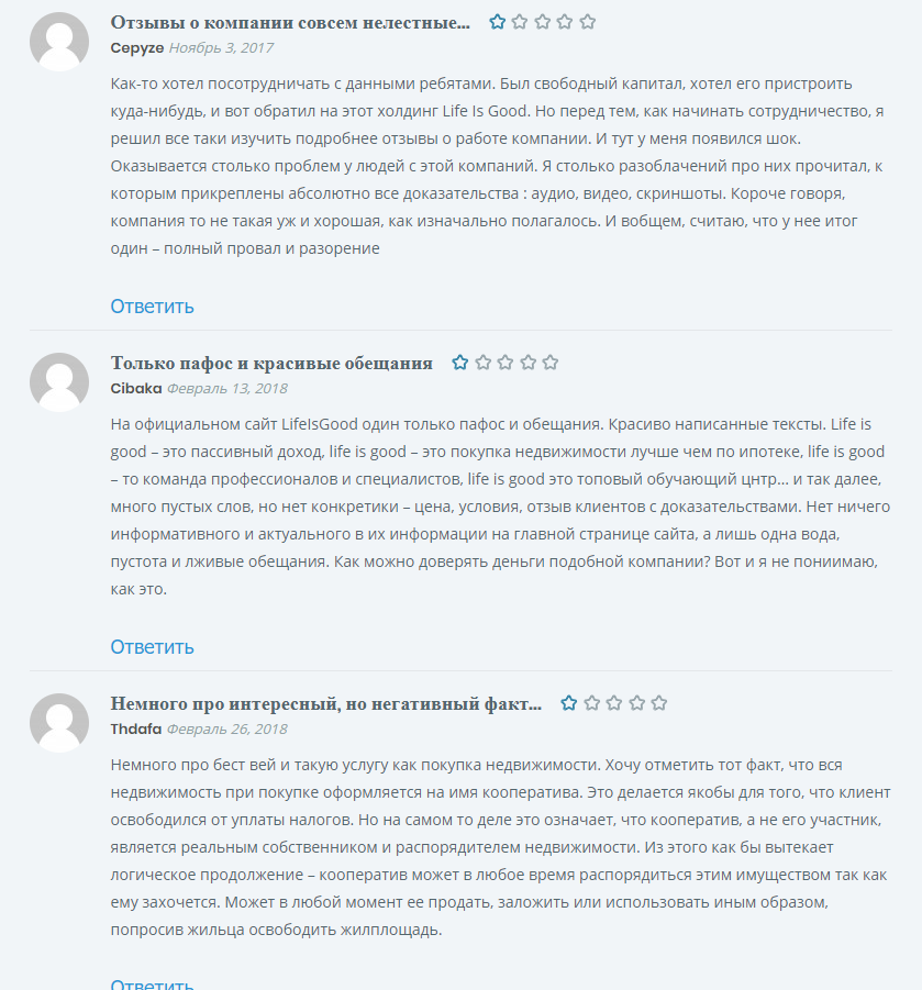 Отрицательные отзывы о о компании лайф из гуд даны и на seoseed.ru, и на otzyvy-portal.ru. Везде холдинг называют настоящим разводом, пишут о невозможности заработка. Борис С.В. рассказывает, что хотел купить квартиру, но в итоге потерял все имущество. Дмитрий К. пишет, что вместо заработка получил лишь долги по кредитам.