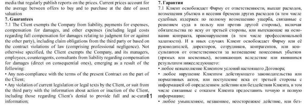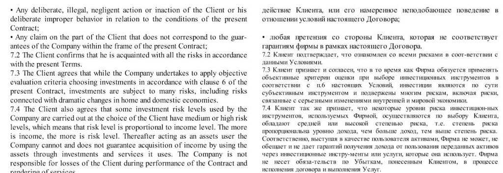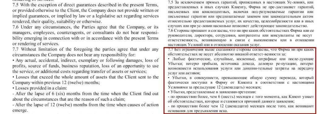 - документы составлены таким образом, что компания снимает с себя всю ответственность за любые риски;