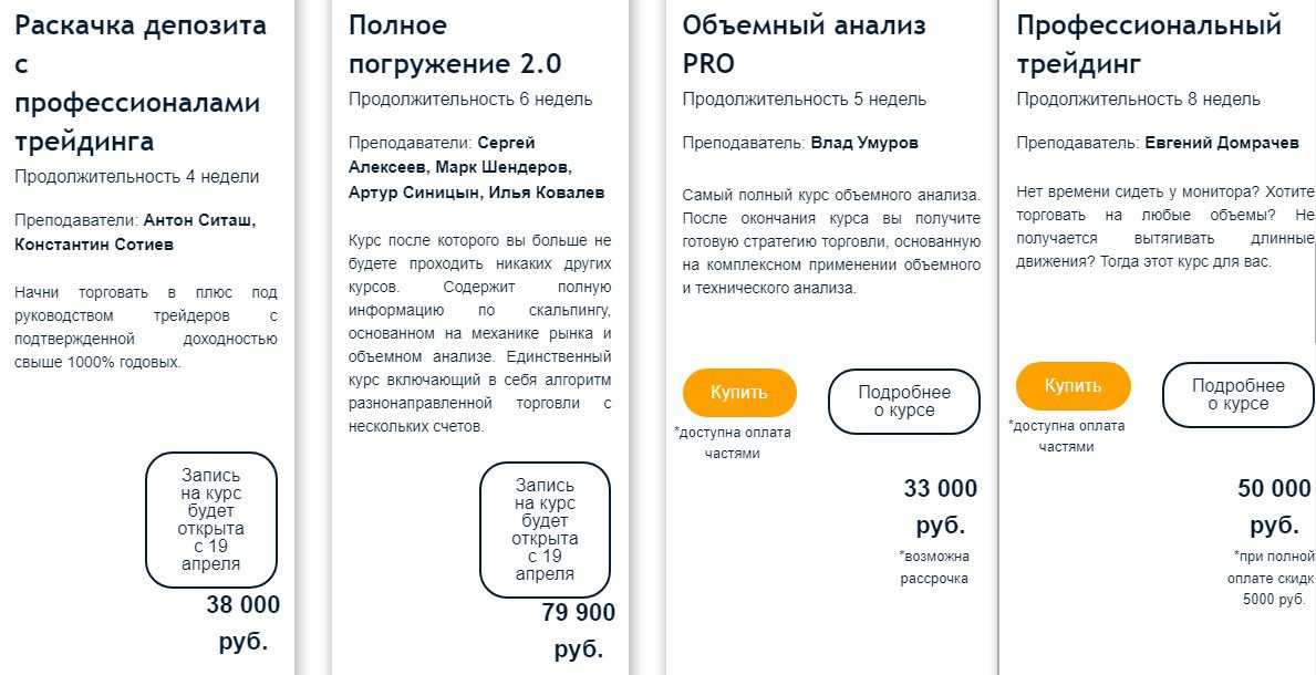 Представители компании обещают обучить новичков азам торговли на финансовом рынке. Пройдя курс обучения, начинающие пользователи будут увереннее чувствовать себя в трейдинге и начнут разбираться в торговых инструментах. В качестве профессионального софта предоставлен Привод Бондаря и ATAS.