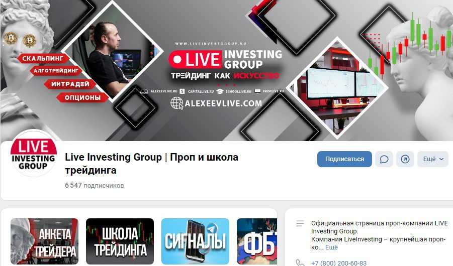 Проп-компания Лайв Инвестинг Групп представлена на многих популярных интернет ресурсах. В ВК на профессиональное сообщество подписано 6 547 человек. Однако посты просматривает лишь небольшая часть аудитории. Посты содержат полезную информацию для трейдеров разного уровня, размещены видеоматериалы с отчетами по прошедшим торговым дням, записи онлайн сделок и прочее.
