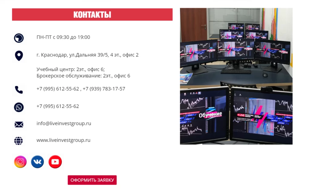 По данным сайта liveinvesting.su, организация Лайв Инвест Групп зарегистрирована в г. Краснодар по адресу ул. Дальняя 39/5, 4 эт., офис 2. В этом же здании, но на втором этаже расположен учебный центр и осуществляется брокерское обслуживание. Проект также представлен и в соцсетях.