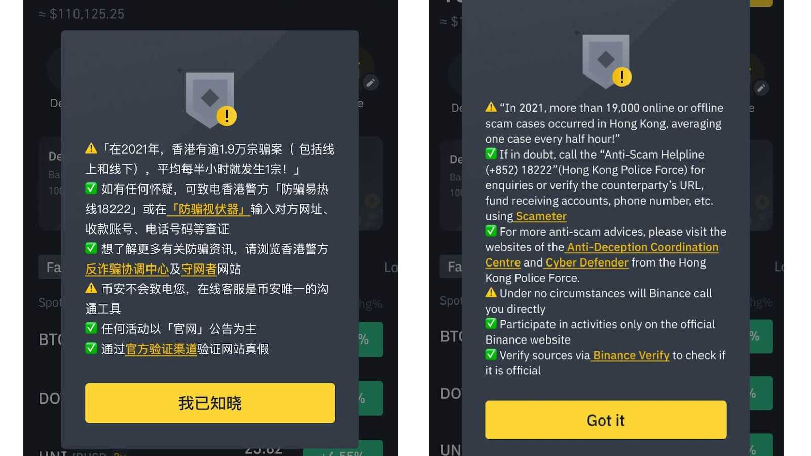 Согласно данным источников Cointelegraph, Binance сотрудничает с Бюро кибербезопасности и технологических преступлений полиции Гонконга для создания системы «предупреждения и сообщения о предотвращении преступлений», ориентированной на жителей Гонконга. В рамках пилотного проекта при попытках вывести средства пользователи получали предупреждения, содержащие информацию о распространённых видах мошенничества вместе с советами о том, как их избежать.