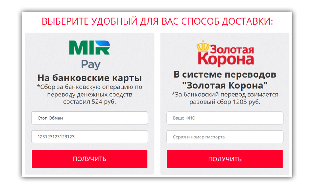 - Далее два способа «получения денег»: на банковскую карту или через систему «Золотая корона». Оба подразумевают «сбор за банковский перевод». Это выдуманный мошенниками платёж, совершив который обманутый человек просто переведёт жулику в карман свои деньги.