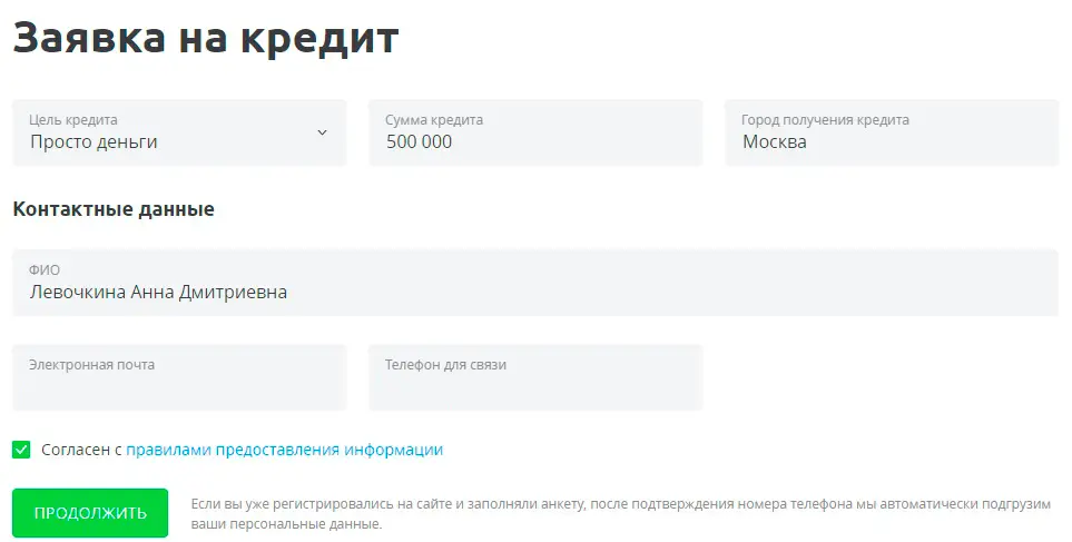В заявке на кредит нужно указать желаемую цель, сумму и город, в котором хотите оформить кредит. Также следует ввести свои персональные данные: ФИО, электронную почту и телефон для связи.