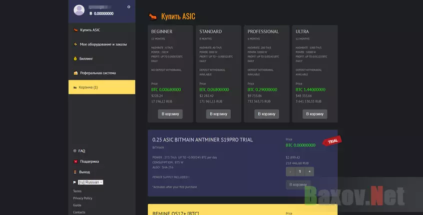 Если вы успешно пополнили счет, отправляйтесь в раздел «Купить ASIC». Там добавьте понравившееся майнинг-оборудование в корзину и оплатите его. После успешной покупке вам придут документы на товар, и вы начнете зарабатывать от 5 долларов в день.