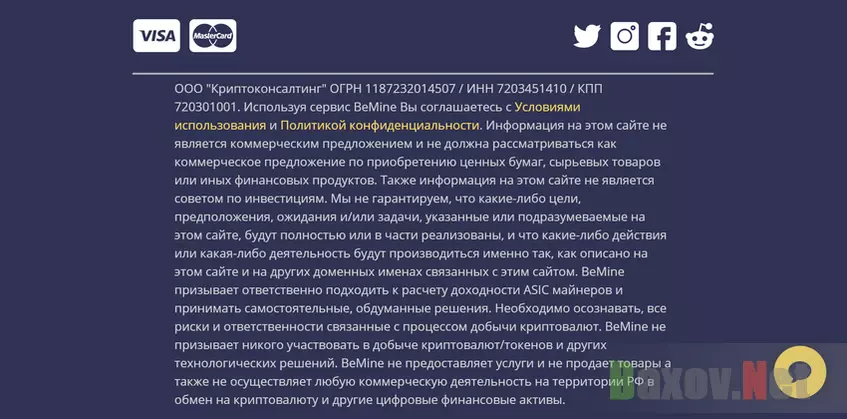 Команда BeMine пишет, что работает в РФ официально от имени ООО «Криптоконсалтинг»: