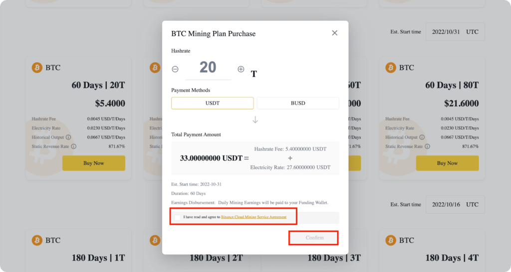 Выбираем мощность, метод оплаты USDT или BUSD (перед покупкой проверь, что на твоем спотовом кошельке есть стейблы).