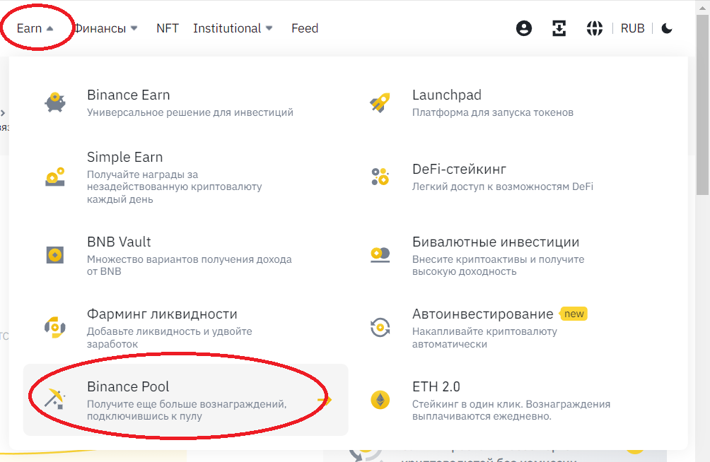 Заходим на Binance и во вкладке Earn находим Binance Pool