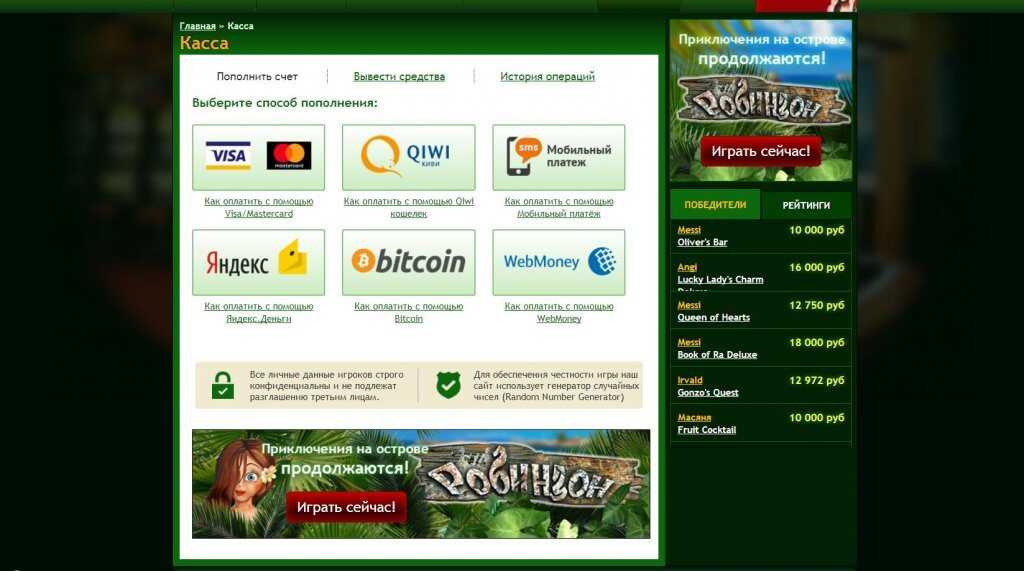 Чтобы играть на деньги, необходимо пополнить депозит. Для этого нужно нажать на кнопку Касса. Популярные способы оплаты: