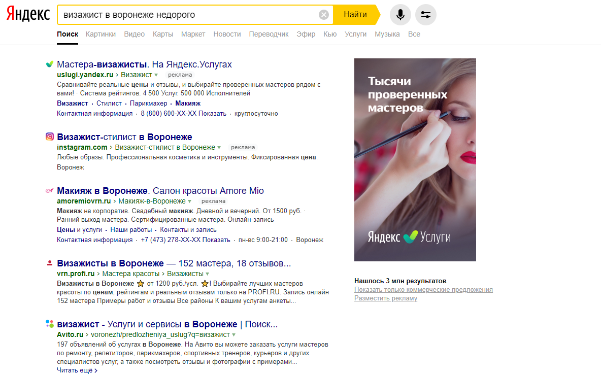 Яндекс продвигает услуги специалистов как непосредственно в сервисе, так и в поиске. Если пользователь вводит в поиске Яндекса запрос, связанный с услугами, сервис ставит предложения от Яндекс.Услуг в первых строчках выдачи.