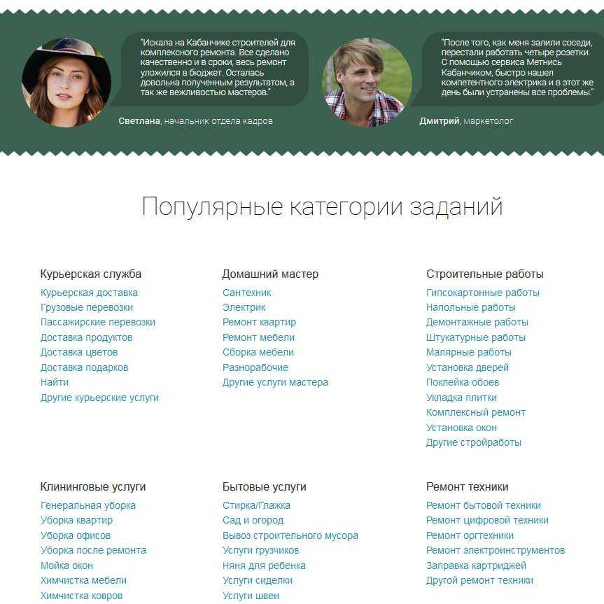 На сервисе постоянно кипит жизнь, и тысячи людей предлагают свои услуги. Вашему вниманию: служба доставки, домашний мастер, способный починить вашу мебель, произвести строительные работы, услуги по уборке помещений, ремонт техники. Также к вашим услугам: раздача листовок, разработка сайтов и компьютерная помощь, уход за животными, образовательные услуги, организация празднеств, красота и здоровье (маникюр, стрижки, наращивание ресниц и т. д.).