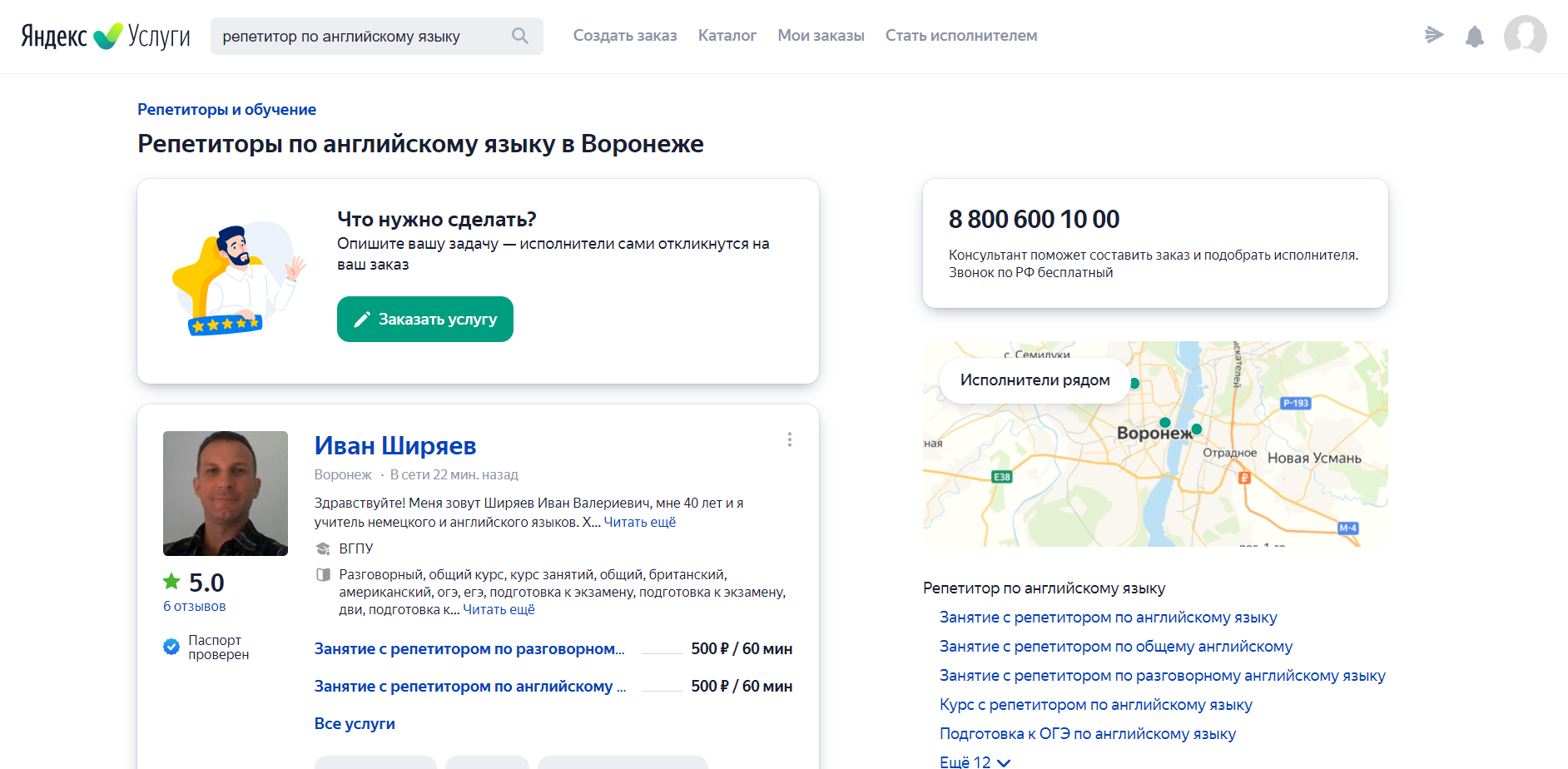 В Яндекс.Услугах пользователь находит специалиста, введя в поиске название услуги, сравнив профили, рейтинг, стоимость услуг и другие параметры.