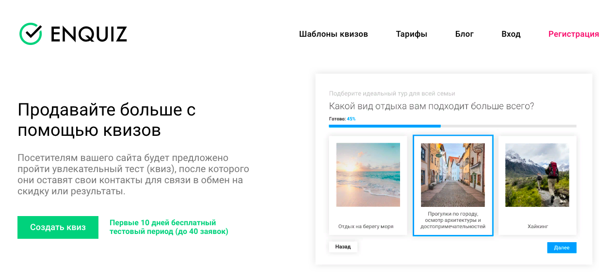 Первые 10 дней использовать конструктор можно бесплатно (до 40 заявок). Протестировать квиз можно даже тем, у кого нет собственного сайта.