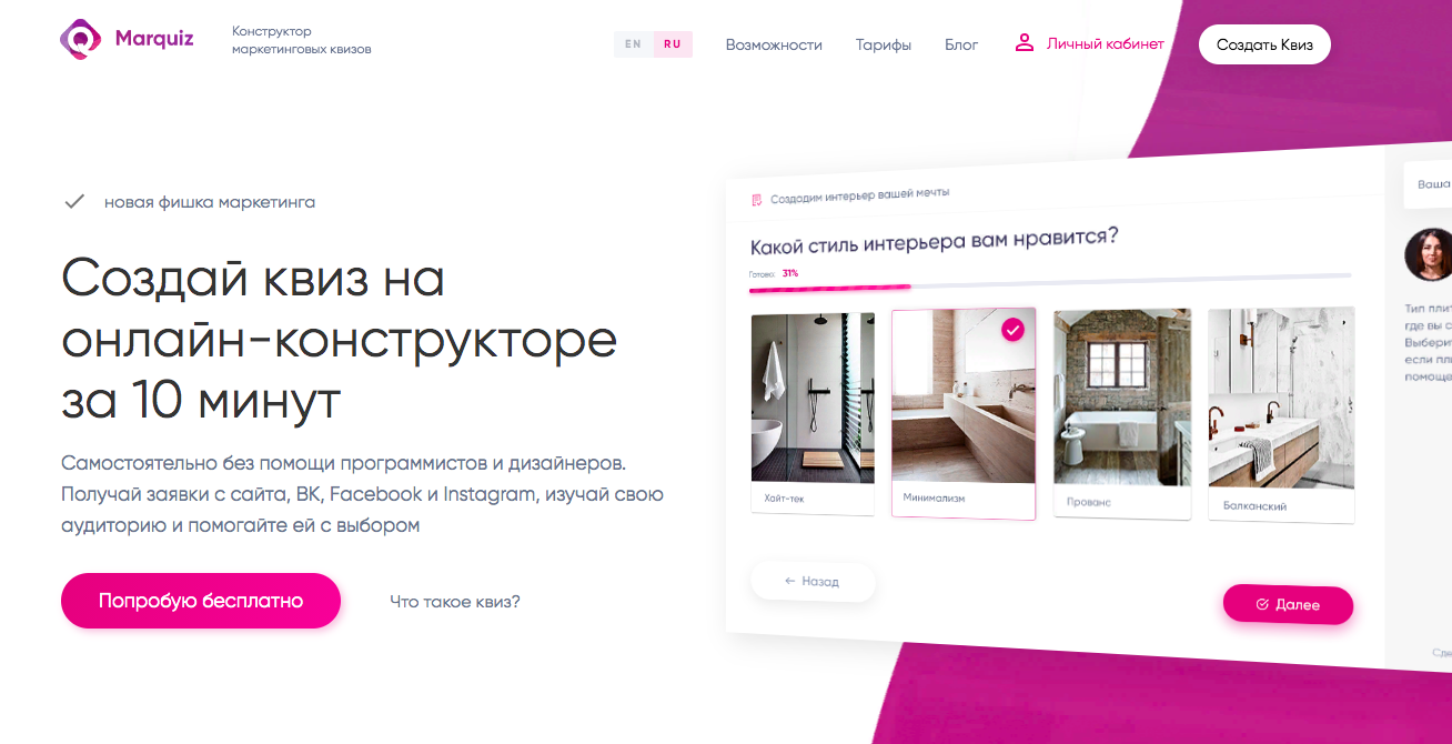 Один из наиболее популярных сервисов для создания квизов. У него максимально понятный и адаптированный под пользователей интерфейс, с которым очень просто разобраться, не имея каких-либо специальных навыков. Marquiz предлагает множество вариантов шаблонов для разных ниш. Можно придумать собственный тест или использовать уже готовые полностью оформленные опросы.