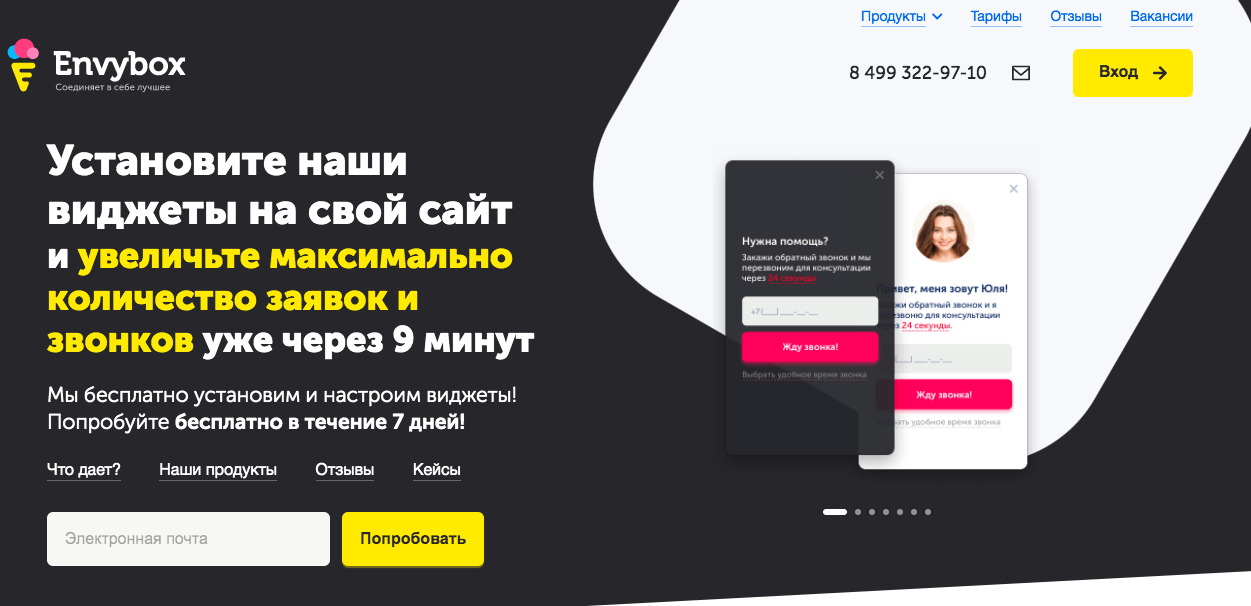 В отличие от предыдущих сервисов Envybox не специализируется на одних лишь квизах, у него достаточно обширный список маркетинговых услуг, которые также могут заинтересовать вас. У Envybox есть варианты различных виджетов, чатов, форм и кнопок для встраивания на сайты.