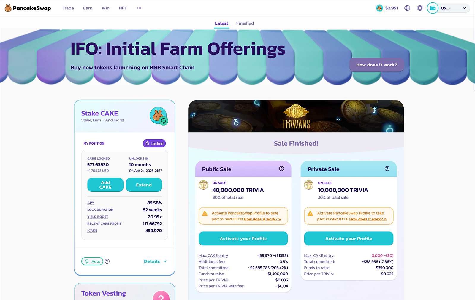 Можно совершать одновременно, как Basic Sale, так и Unlimited Sale. Однако, если у пользователя только небольшая сумма, то лучше всего начать с базовой или ограниченной продажи. Минимальная сумма внесения — $10. За участие в каждом IFO клиент получает по 100 бонусных баллов от PancakeSwap.