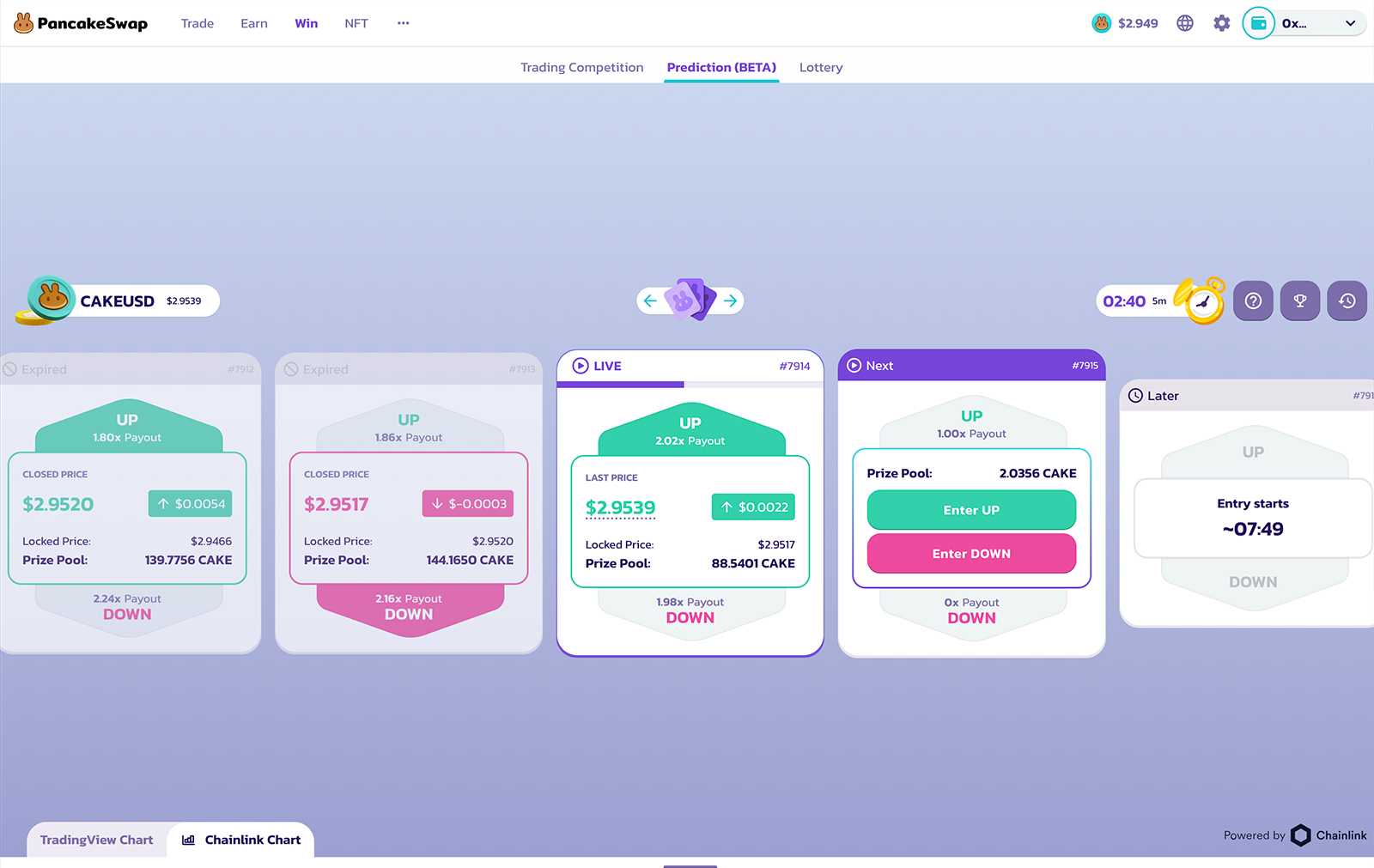 Каждые 5 минут собирается банк из тех, кто полагает что BNB вырастет или упадёт по отношению к доллару. Итоговый банк распределяется между победителями, выдавая умножение согласно коэффициенту. Данные предоставляет сеть оракулов Chainlink.