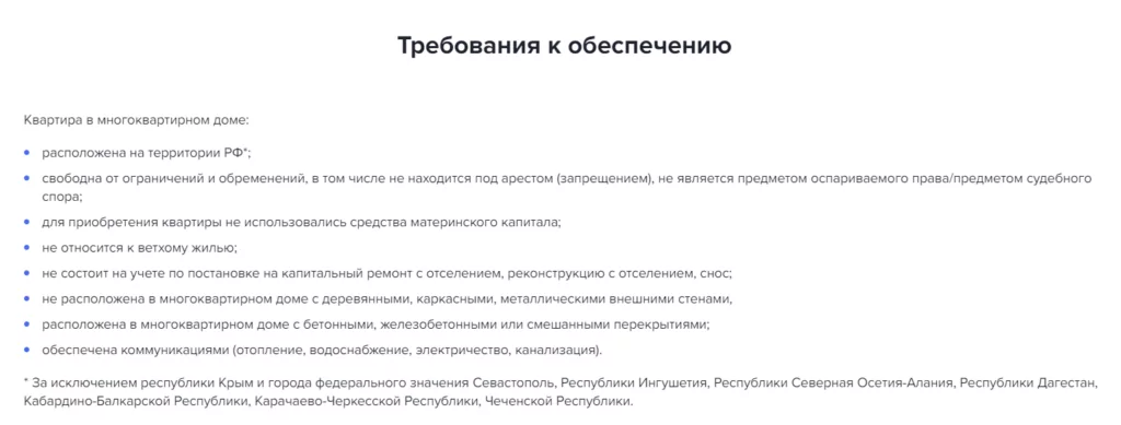 - Требования к недвижимости — квартира без обременений в многоквартирном доме