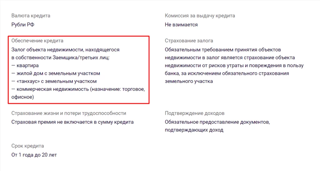 - В качестве залога рассматривается недвижимое имущество на территории РФ, кроме того, которое целиком или в долях принадлежит несовершеннолетним. Дом без участка, земельный участок без дома и коммерческая недвижимость должны находиться в регионе присутствия банка