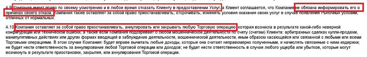 Соглашение составлено таким образом, что компания снимает с себя всю ответственность, а также имеет право в любой момент заблокировать аккаунт клиента без объяснения причин. То же самое касается и сделок — брокер в праве приостановить любую торговую операцию.