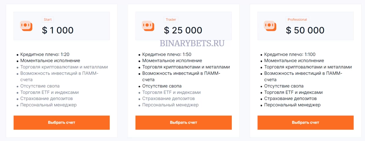 После регистрации пользователь может выбрать один из трех счетов. Минимальная сумма для первоначального взноса составляет $150. Кроме того клиентам доступно кредитное плечо и страхование депозита.