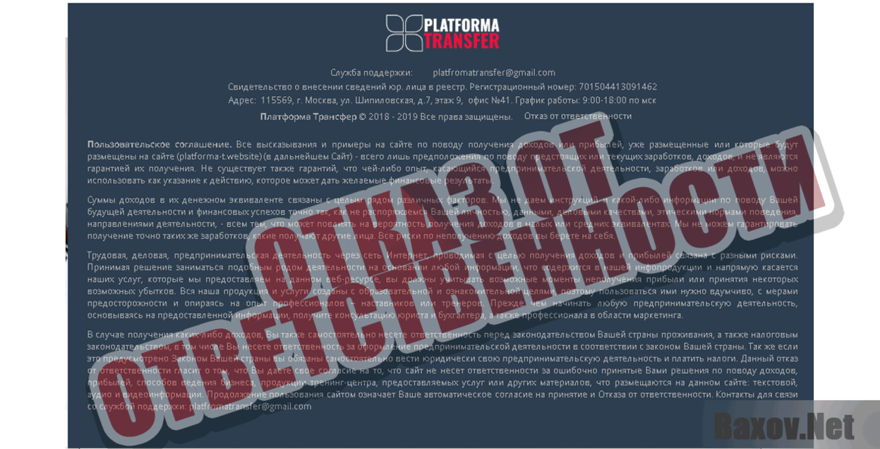 По легенде компания PLATFROMA TRANSFER – специализированная площадка (компания), занимающаяся поиском и привлечением заказчиков из зарубежного рынка на русскоговорящий рынок, для перевода их информационных материалов на соответствующий язык с последующим денежным вознаграждением.