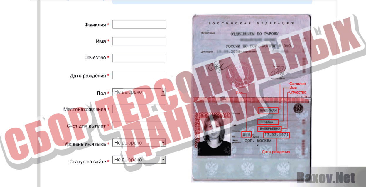 Далее нас перенаправляет на страницу с информацией об мошенниках. Требуется подтвердить свои данные. Зачем справа образец паспорта — непонятно. Ведь вроде ввод данных о паспорте не требуется