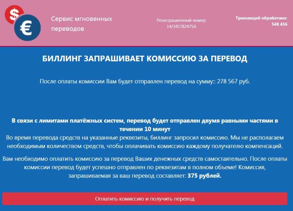 Мы заплатим 375 рублей, чтобы доказать вам, что вывод здесь просто невозможен. Итак, оплатим комиссию и получим перевод, ну во всяком случае попробуем. Сразу же после оплаты конечно же запрашивается очередная комиссия, якобы мы сейчас заплатили за первую часть перевода и теперь нужно оплатить за вторую.
