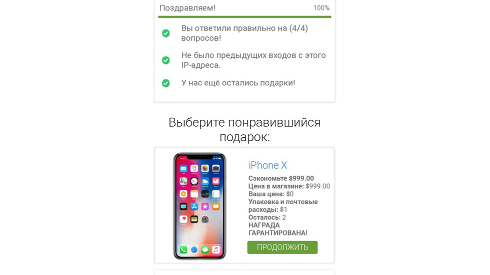 Развод заключается в том, что после прохождения опроса пользователя просят оплату доставки iPhone или, что еще хуже, установку специального приложения на смартфон. Приложение оказывается вредоносным. Оно переводит деньги с банковского счета жертвы.