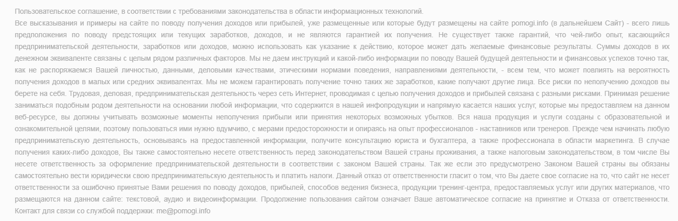 Все высказывания и примеры на сайте по поводу получения доходов или прибылей, уже размещенные или которые будут размещены на сайте pomogi.info (в дальнейшем Сайт) — всего лишь предположения по поводу предстоящих или текущих заработков, доходов, и не являются гарантией их получения