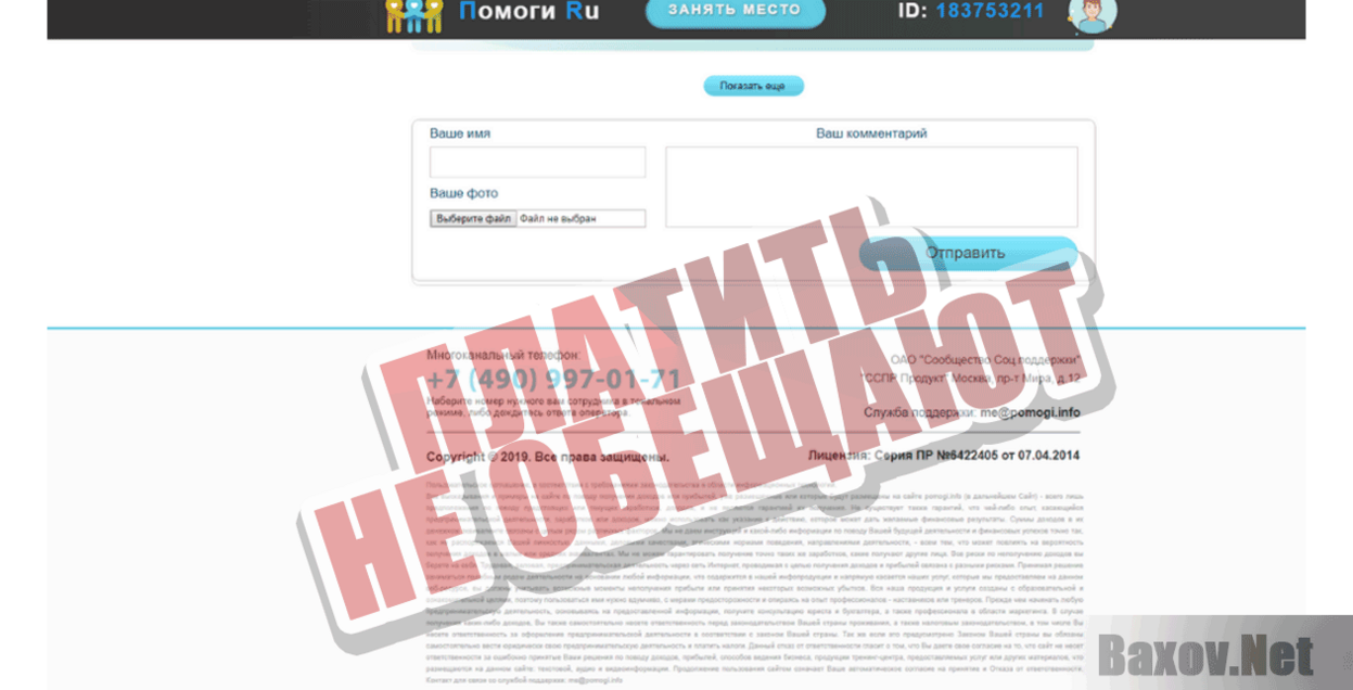 На сайте можно увидеть, что организатором является компания ОAО «Сообщество Соц.поддержки». Лицензия: Серия ПР №6422405 от 07.04.2014. При проверке оказывается, что в реестрах нет никакого ОАО «Сообщество Соц. Поддержки», есть похожие названия компаний, но указаны все их сайты и нет никакого упоминания о pomogi.info. Мошенники просто выдумали название чтобы вводить людей в заблуждения, уверяя их что все законно.